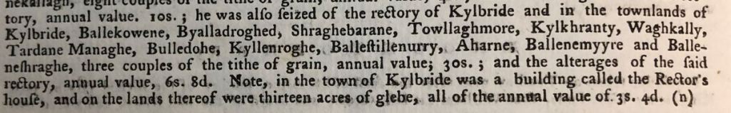 ” In the town of Kilbride was a house, called the rector’s house, and on the lands therof were 13 acres of Glebe, all of the val. of 3s. 4d.” Archdall, p. 806. This cannot now be determined, it having fallen out of the hands of the church. The td. contains the ruins of a church and some brickyards. The land is arable and pasture; but some of it is subject to heavy floods.
