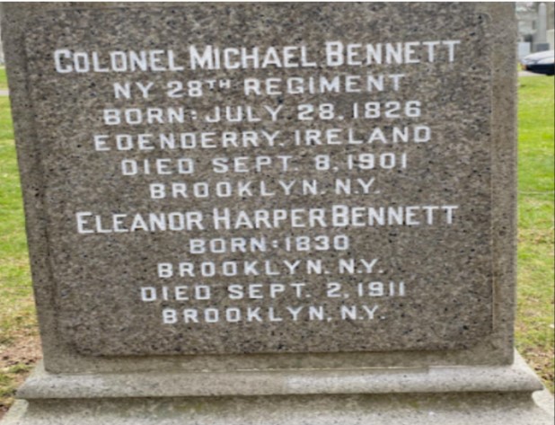 Cadie Robertson is a direct descendant of Michael Bennett and has valuable information on the Bennett family from Edenderry. She and Danny Leavy have been in constant contact over the past years. Cadie’s information has been invaluable in putting together Michael’s story and along with Danny Leavy, I cannot thank them enough for making sure we were in some way able to put together his story. Cadie and Danny uncovered an amazing piece of information while researching Michael. As strange as it sounds the Bennett family plot in Brooklyn, which was paid for by Michael Bennett, does not bear his name on its impressive marker. The reason seems entirely unclear. Why would this man who had done so much not have his name on his family plot? Cadie has found evidence from 1969 where her family had tried to correct this strange anomaly, but up to this time the name of Colonel Michael Bennett is not inscribed on the marker.