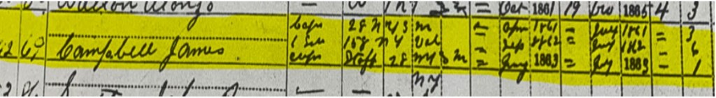 James Campbell was born in Edenderry in 1833 to parents John Campbell and Elizabeth Bennett. His baptism record can be found in the Rhode Parish Register. This was not unusual at the time as several residents of the Monasteroris area were baptised within the parish of Rhode. You will notice the name Bennett appearing again, and there is a direct connection to Colonel Michael Bennett. James Campbell was in fact a nephew of Michael Bennett and Grandson of Margaret Fullard. The Bennett, Fullard and Campbell families were living in the same area in the early 1800s and the Griffiths Valuation, a British Government survey of all property in Ireland completed in the 1850’s, would still show Campbell and Bennett families living close by each other in this district of Monasteroris.