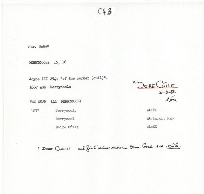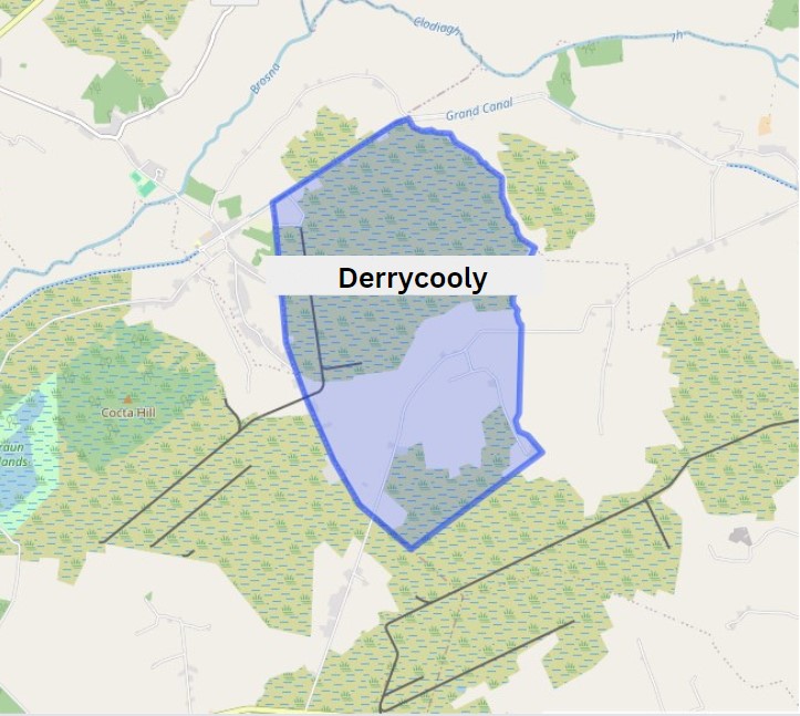 Derrycooly is in the Electoral Division of Derrycooly, in Civil Parish of Rahan, in the Barony of Ballycowan, in the County of Offaly. The Irish name for Derrycooly is Doire Cúile meaning Corner wood.