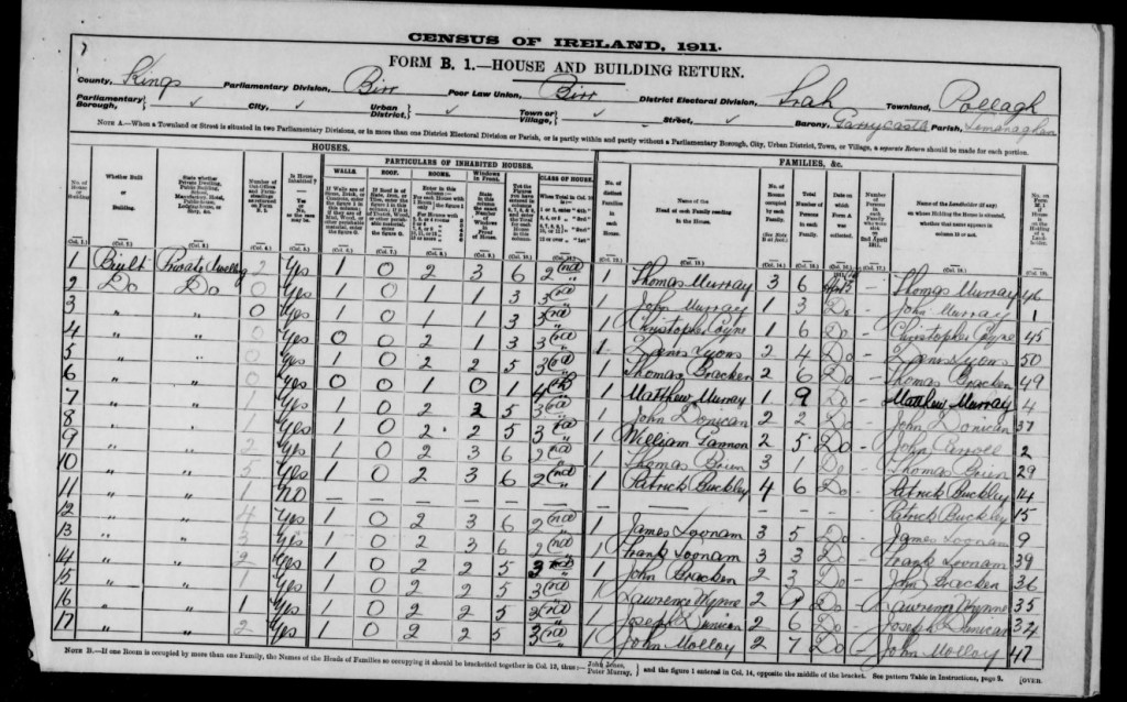 In 1911, Pollagh had one of the largest population and houses recorded in the census for this district, during this period the household returns and ancillary, and shows us that there were 50 private dwellings, with 47 inhabited, all between 2nd and 4th class category. The people who occupied these houses were between the ages of 1-76 years, with occupations that included boatmen and farmers. Below shows some of the families during this time.