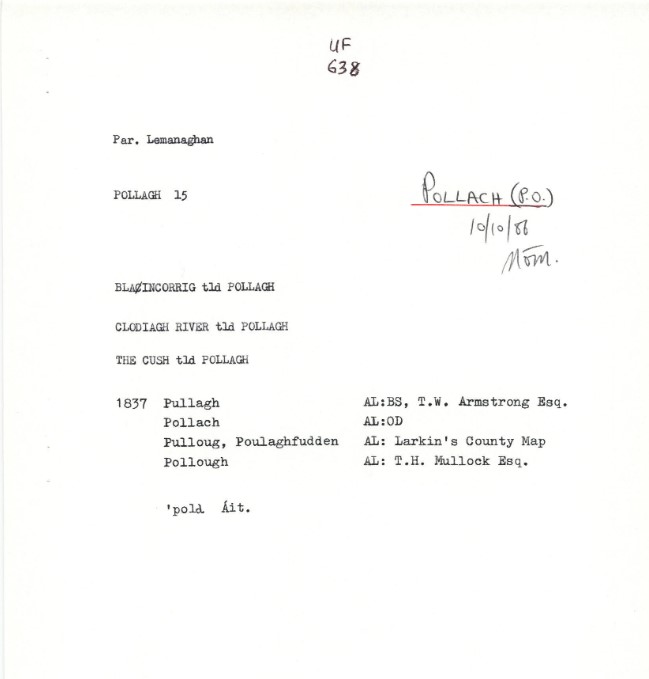 Pollagh also spelt as Pullough, is located in a small village in County Offaly, it is in the Civil Parish of Lemanaghan. A small parish, it extends from Ballycumber to Ferbane. Pollagh village can be found on the north side of the canal. The Parish lies in the territory of Dealbhna Eathra of the MacCoghlans – an ancient people. It has a rich heritage in its archaeology including the important monastic site, churches, and ringforts and the famous castles.