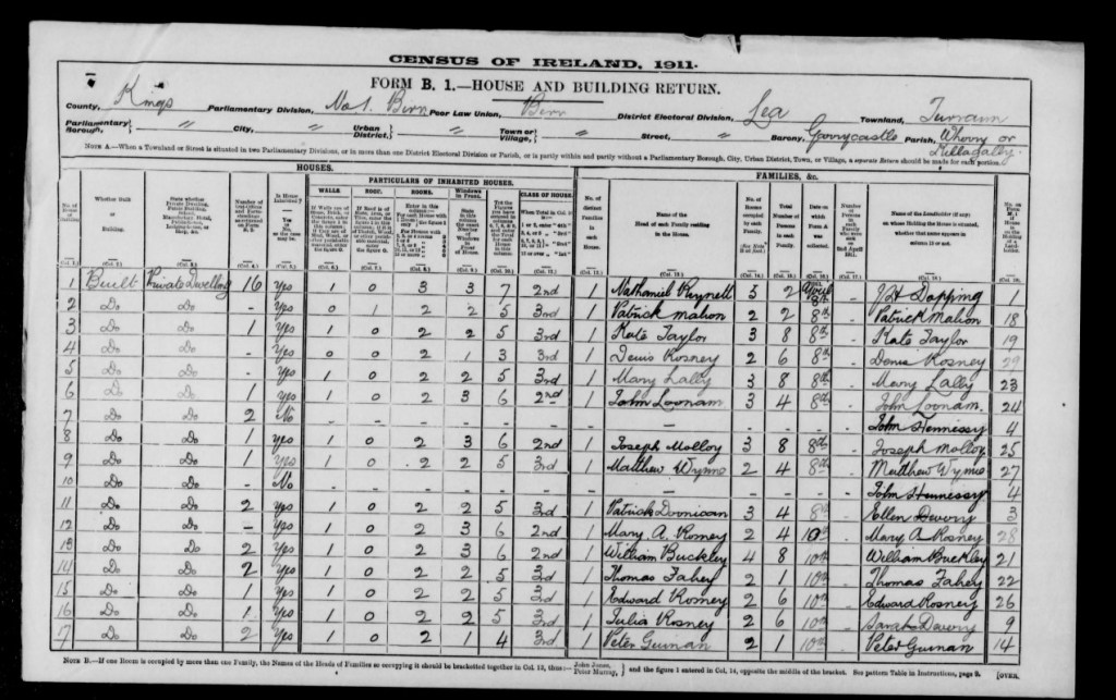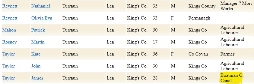 In 1911, Turraun had 26 houses on record in the census, during this period the household returns and ancillary, shows us that there were 23 of Private Dwelling inhabited, all between 2nd and 4th class. Members that occupied these buildings were between the ages of 1-84 years, with occupations of farmers, servants and boatmen who worked along the Grand Canal Line. Below shows some of the families during this time.
