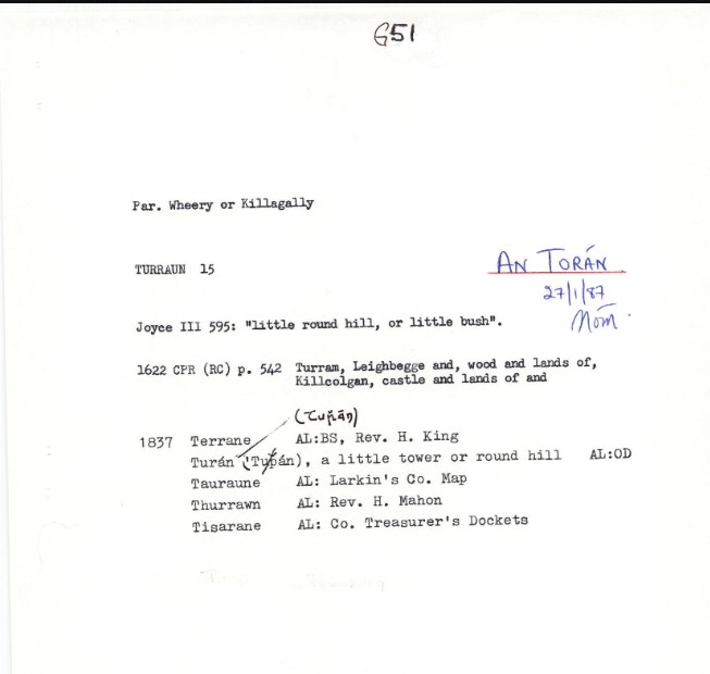 The Irish name for Turraun is An Torán meaning The Little Tower or Small Hill[3].