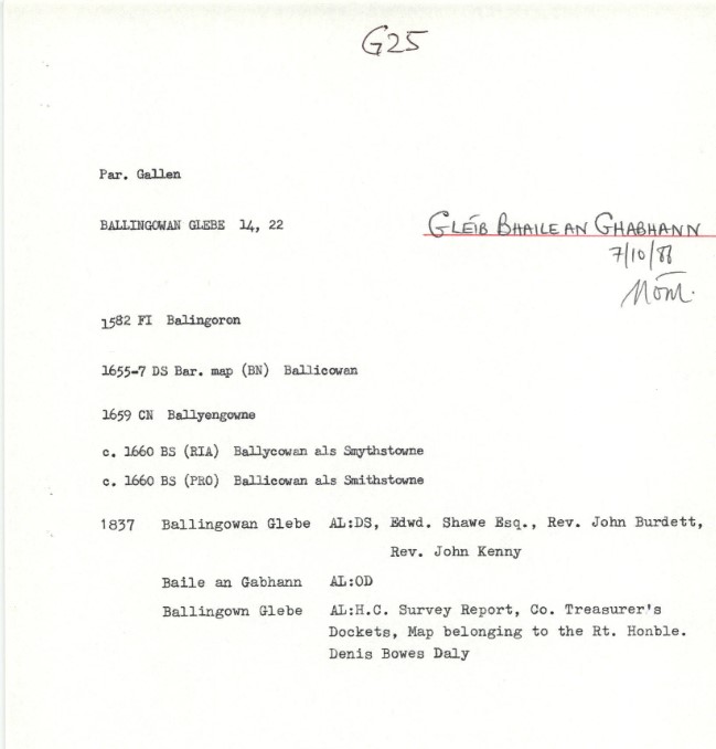 The Irish name for Ballingowan Glebe is Gléib Bhaile an Ghabhann meaning land of the blacksmith.