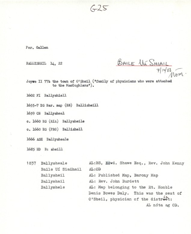 Ballysheil is in the Electoral Division of Gallen, in Civil Parish of Gallen, in the Barony of Garrycastle, in the County of Offaly. The Irish name for Ballysheil is Baile Uí Shiail meaning the town of O Siail.