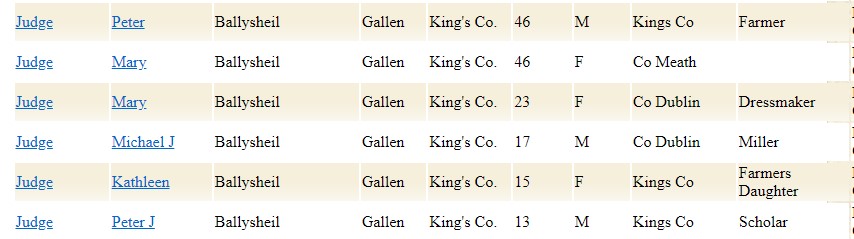 During this time Ballysheil had eight buildings all of private dwellings. With 7 occupied with families between 3-9 members in each. These houses where of 3rd and 2nd class. Example of a household can be seen below.