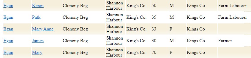 In 1911, Clonony Beg had a one of the largest population of this area recorded in the census, during this period the household returns and ancillary, shows us that there were private dwelling buildings with all inhabited, of 1st, 2nd class and the other 3rd. Here is an example of families that occupied these buildings are as followed: