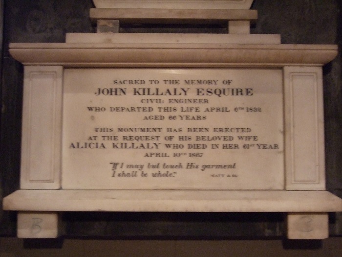 Around this time, Killaly married Alicia Hamilton and three of their sons later graduated from the University of Dublin, two of them following their father in his profession. Along with a younger brother John Sackville Killaly, Hamilton Hartley Killaly (1800-1874) emigrated to Canada in 1834 and later became the first president of the Canadian Society of Engineers.