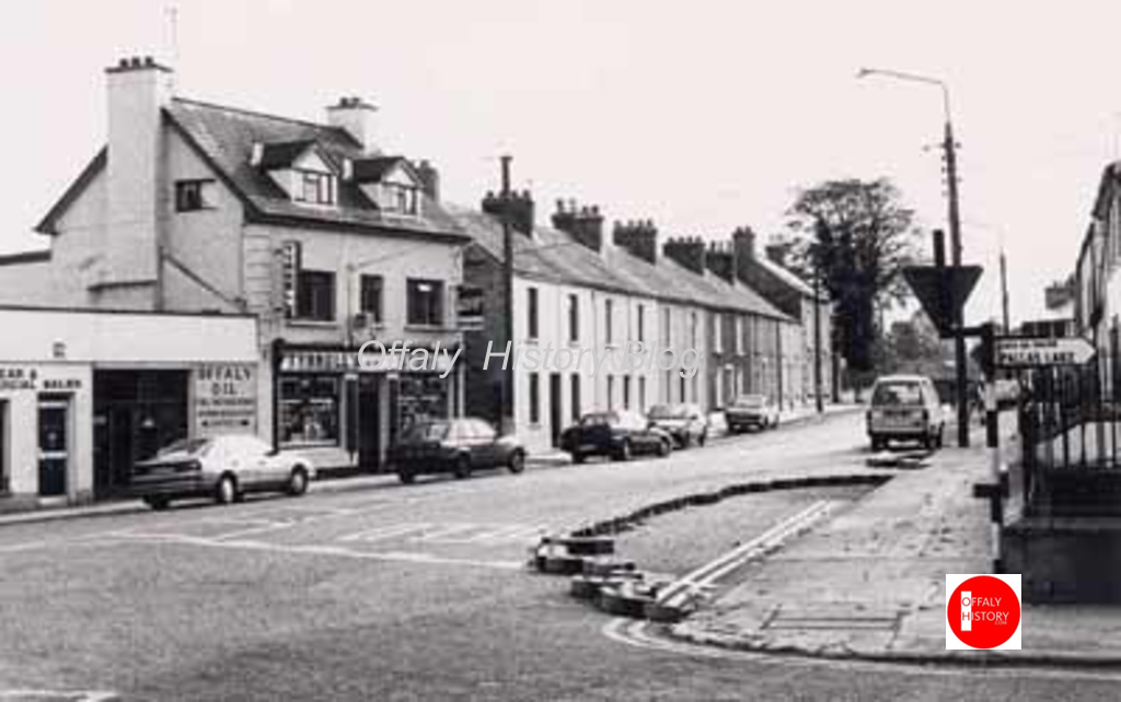 - The first lease affecting the building line in the street was that from Lord Tullamore to Richard Moore at no. 36 High Street. In 1756 Lord Tullamore leased to Richard Moore the elder, a plot of ground and dwelling house in High Street (now Spollan’s pub). The plot was long and narrow and connected this house with lands in O’Moore Street from what is now Heffernan’s/Circle K filling station to Moore Hall in O’Moore Street also owned by Richard Moore. The old wall east of the filling station follows the property boundary in the direction of what is now Spollan’s pub taking a curve towards High Street. The curve, reflecting the old 1750s property boundary, can be seen from the grounds of Coláiste Choilm and examined on the 1838 OS map. This is the only such town lease to provide for two houses connected by an extensive garden and fronting two streets rather than as a terrace. Moore wanted for his Killeigh road residence rural bliss and a southern aspect not far from his place of business in High Street. The High Street holding has a garden of at least 500 ft in length (where the carpark is today) and from there extended along the boundary of what is Coláiste Choilm (St Columba’s CBS for diaspora readers) to a three to four acre holding running to the built Moore Hall. The Heffernan holding today would largely match this leasehold extent on the O’Moore Street side.