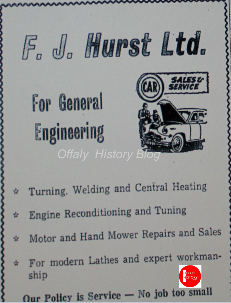 In this ‘Buy Irish’ age, with so much stress of the purchase of home-made articles, here is a perfect, example of where true patriotism can be shown. Not alone is the purchaser, if he is local, buying Irish, he is also supporting a firm and an article made right in his own town. If we had more men with the drive and initiative of Mr. Hurst then we would have no fears for the future of our economy. As an employer he is an outstanding example of how to treat those under him. No job of work holds any fears for him and his friendly attitude to his employees plus his working example all add to make the Hurst motor ‘family’ a true family and a happy one.[1]