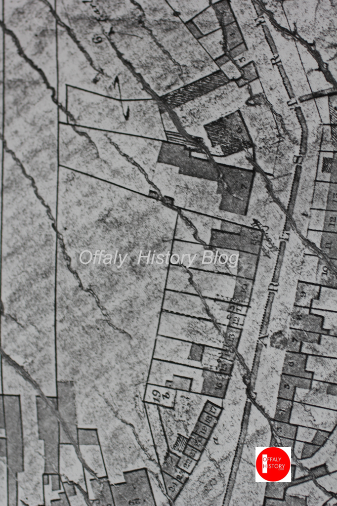 We mentioned in previous articles the legacy of the two great large-garden leases at either end of O’Moore Street on the north side. The leases, from the first earl of Charleville (d. 1764, owner of the town of Tullamore) go back to 1756 (Hurst) and 1758 (Motor Works) and were connected with significant leases for Moore (1756, Hurst 1920s) and Dr Crofton (1758, Roberts 1930s). Both holdings had long gardens to the Killeigh road verging on the countryside in the 1750s to 1800s period. Both fronts to the Killeigh Road or Windmill/Earl/O’Moore Street took all of the street on the northern side, but with house nos GV 6 and 7 built on the Crofton leasehold together with over 10 cabins or poorish houses from the corner with High Street and extending to the Cottage. And as to Hurst from the pair of houses east of Moore Hall to the entrance to the Colaiste Choilm school, itself built on the park of what was the Williams’ house up to 1951 when bought by the Christian Brothers (the house is now that of Farrellys).