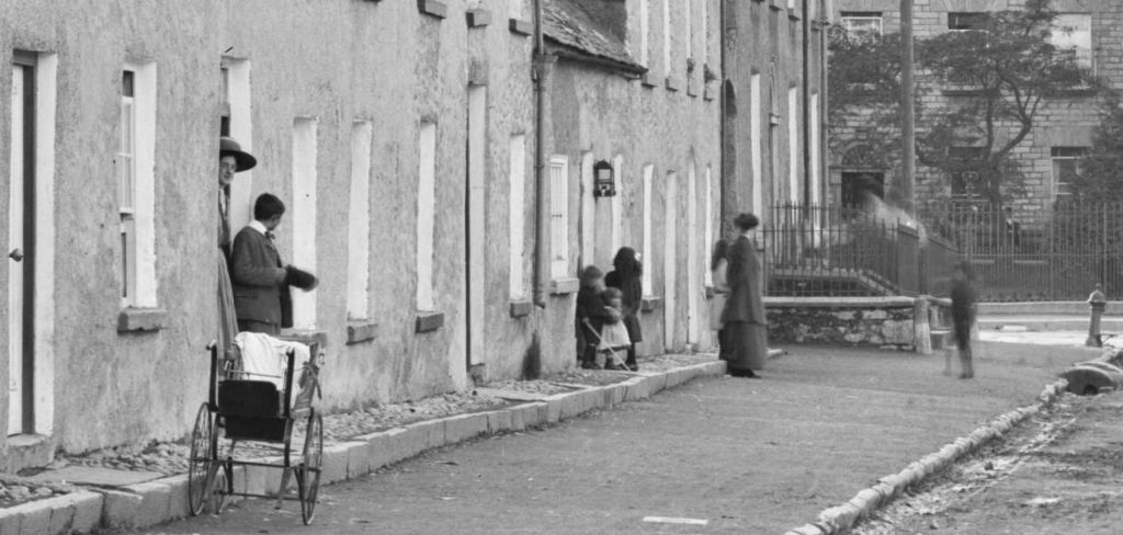 In 1901 the population of O’Moore Street was 173 (of which 100 were female) with 36 inhabited houses and 1 uninhabited, in which lived 38 families. Two houses each contained two families. This was little different to sixty years earlier. All the houses were stone-walled and the roofs slated with the exception of two which was thatched (probably the later Furlong house and one opposite beside Moore Hall; three houses were placed in the first class, thirty in the second and four in the third. The outbuildings included six stables, four coach houses, three piggeries and three fowl houses.