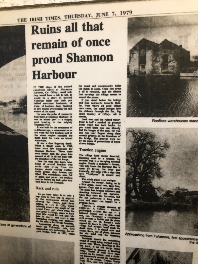 ‘If the steps of the ruined canalside hotel at Shannon Harbour, Co. Offaly could talk they would have a tale to tell. It would be a story of bustled Victorian ladies and their potb-bellied merchant husbands, of trade, of business deals finalised in airy rooms overlooking the still waters of the canal.