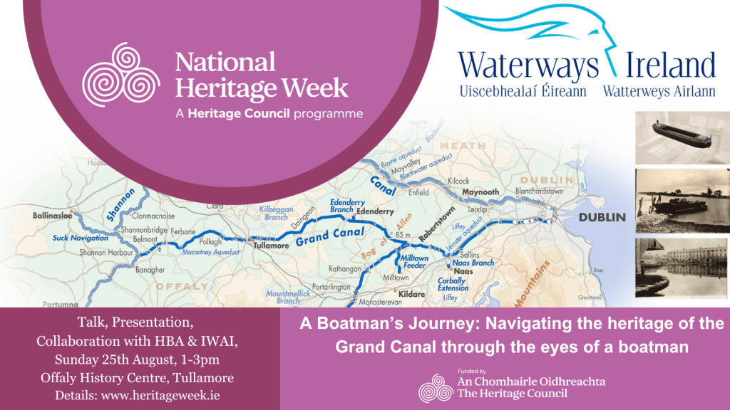Things have improved so much in recent years with the towpaths now the focus of attention to promote walking and cycling. Today 23 August see the launch of an excellent study of the canal system as illustrated. Then on Saturday evening and Sunday there are two events from Waterways Ireland to be held in the Offaly History Centre Exhibition Hall beside the canal at Bury Quay (neighbour to Old Warehouse Bar and Restaurant), as illustrated.