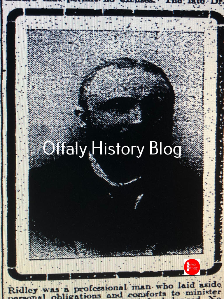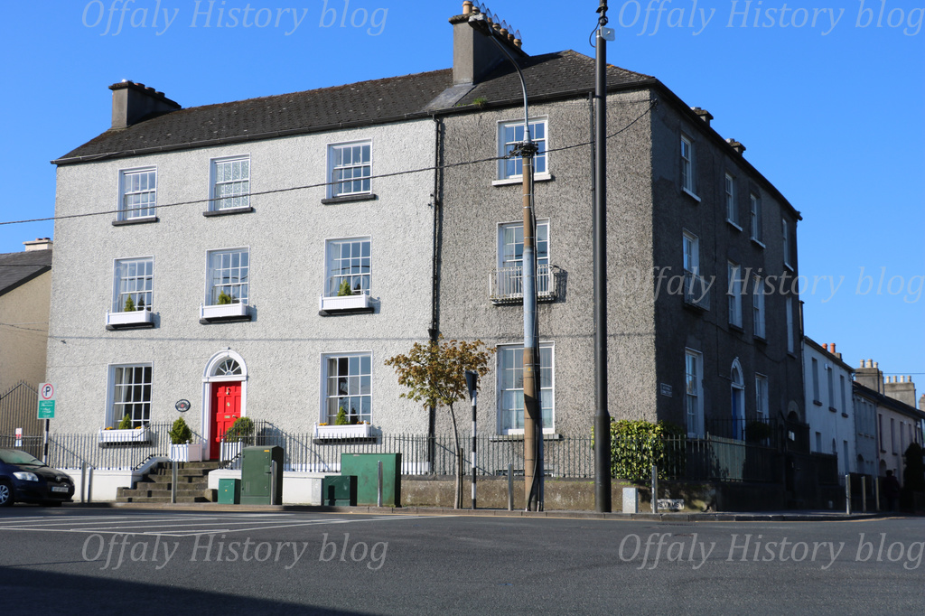 In the first house at the junction with Earl/O’Moore Street (now Brian and Maura Adams) lived Dr George Pierce Ridley. He was the last of the Ridleys of Tullamore and died in 1906. His family, including Dr Pierce, the son-in-law who had lived in Acres Hall, had been physicians to the county infirmary in Church Street since 1817. He was a widower and his only child, then aged 17, had the benefit of a governess and two servants.