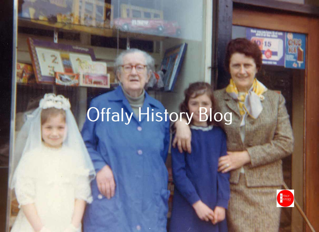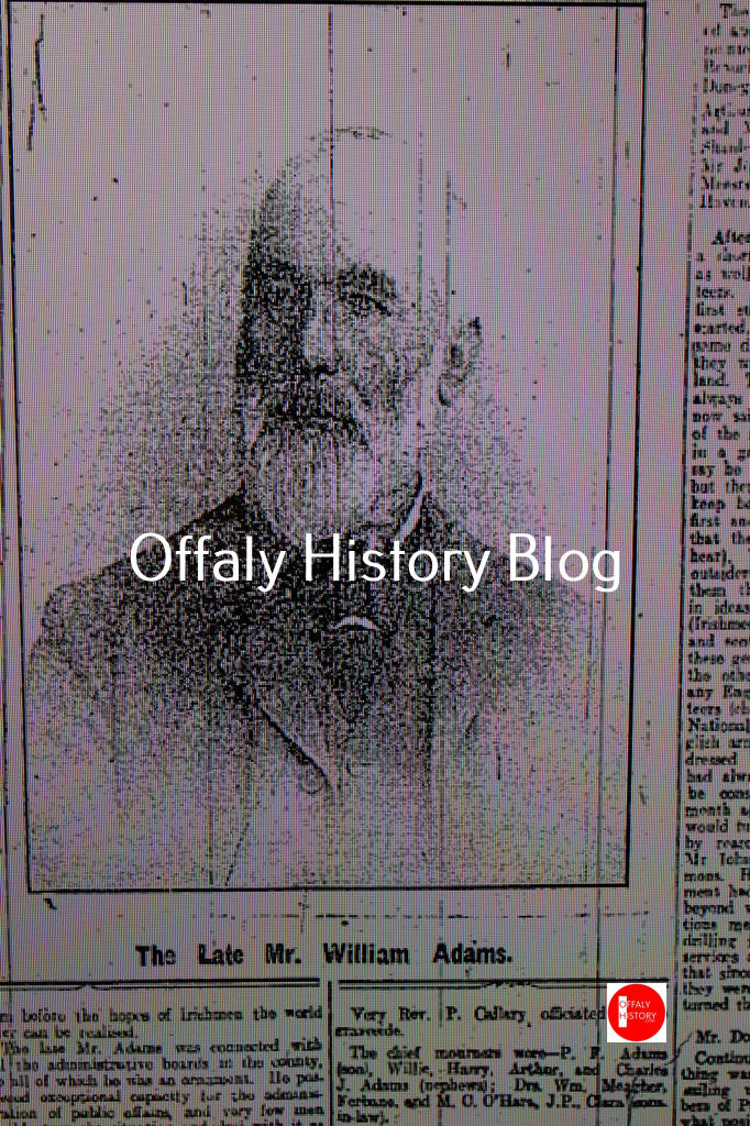 James Carter with a temperance hotel was in no 5, Patrick Lloyd, the grocer and shopkeeper was in no. 7. Michael Kemmy was in no 21 and kept a lodging house. William Adams (form no. 30 in the census and 3 in Griffith’s Valuation of 1854) was in what is now Dr Delaney’s house beside the courthouse. Adams was then aged 62 and lived on until 1914. His son Patrick, aged 19 in 1901, was elected to the town council in 1913 but did not succeed in the by-election for the vacant Westminster seat in North King’s County in 1914. Beside William Adams in 1901 was John Lavin (aged 36) the national teacher. He was renting and in 1916 built the red brick house on Charleville Road near the junction with Dillon St, where his daughters still lived in the 1960s. Donald Pierce, great grandson of Thomas Acres was living in the terrace opposite what was Lloyd’s shop and was RC. His son Bernard was born in South Africa and another son John, was the parish priest of Rathmines in the 1970s.