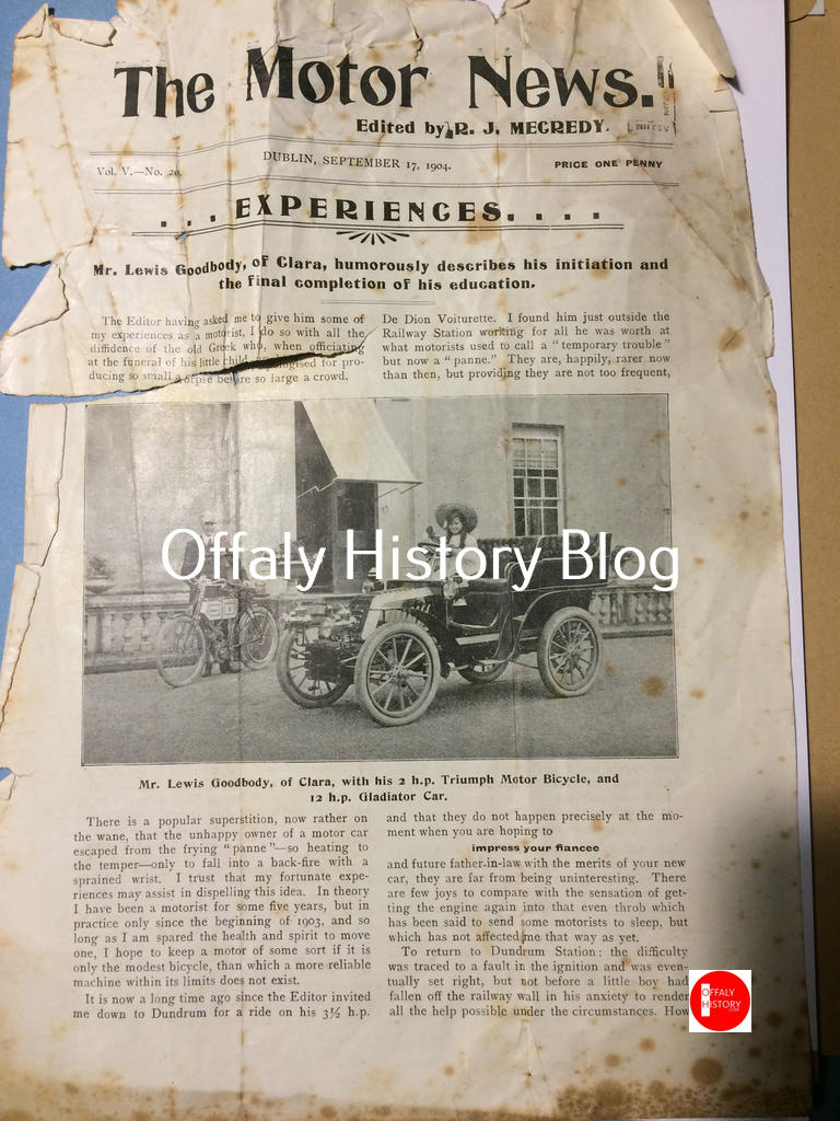 The registration of motor vehicles began in 1904 and the early registers are now in Offaly Archives. In the period from 1904 to 1923 about 820 motorised vehicles were registered in Offaly. This would include motorised bicycles and some registrations from other counties. In the first year 14 motor cars and 20 motor cycles were registered in Offaly.[1] The Birr-based King’s County Chronicle published the first list in 1909 of 68 registered motor vehicles and commented: