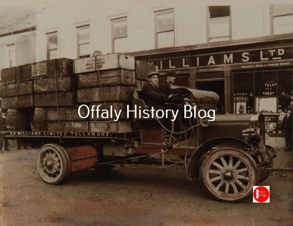 In the ten years before the war Tullamore had clearly made great strides. D.E. Williams was the first to introduce motorised transport to Offaly in 1898, the vehicle taking three hours for a trip from Tullamore to Birr. Both of the Egan’s and Williams’s firms mechanised with the adoption of the motor lorry, which initially their workers had objections to, but by 1916 was very much in use to serve their respective branch-shop networks. Thomas English, the Tullamore baker, was the first to introduce the motorised bread delivery van in the town in 1912. Hayes’ Hotel followed in early 1916 and even the Post Office was having mails delivered from a depot in Moate by late 1916.