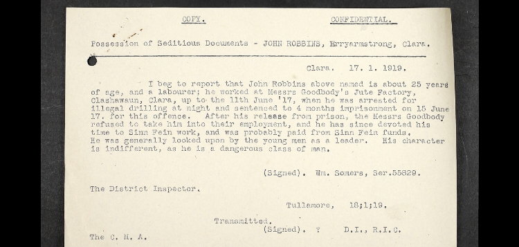 Sean Robbins was born at Erry, Clara in 1892. After his father’s death he was raised by his mother Mary, a domestic servant. Robbins worked as a labourer in Clara’s main employer the Goodbody Jute factory.