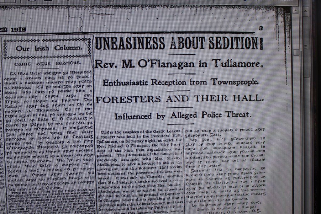 The war was barely over when the Spanish ‘flu arrived causing death, the closing of schools and the cinema.[6] By February 1919 it was largely back to normal and the Foresters had one of its largest attendances in years with 240 present and the health of Chief Ranger Philip Reilly proposed. P.F. Adams was recalling the night twenty ago when the Foresters was started.[7] A few weeks later it was the turn of Fr Michael O’Flanagan, vice-president of Sinn Féin, to speak in the hall, standing in for Mrs Sheehy Skeffington. The talk was under the auspices of the Gaelic League. O’Flanagan got a rousing reception.[8] It was a difficult one for the Foresters as they had been warned by the police that the Foresters Hall committee would be held responsible for any seditious utterances and initially refused to make the hall available unless undertakings were given. Fr O’Flanagan refused and it was the threat of forcible entry that allowed the meeting to proceed. This came about as large numbers were waiting to gain admission to the locked hall including prominent clergy such as the republican Fr Burbage of Geashill. Fr Burbage when asked to sing in the concert said he would only sing a song lest should catastrophe befall them – alluding to the three policemen present including Sergeant Cronin (he was shot and killed nearby by the local IRA on 31 October 1920).[9]