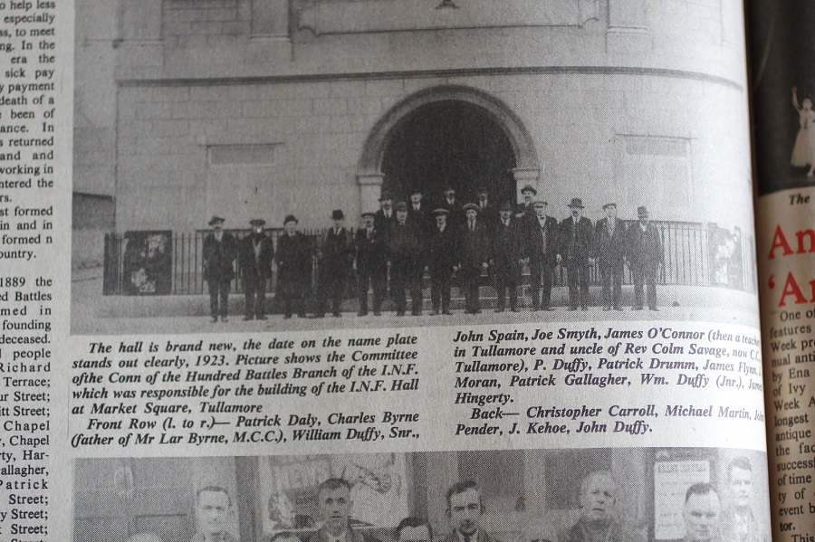 The Foresters continued to march on St Patrick’s Day, but it is nothing like it was in that glorious first twenty-five years. In that period the Foresters fully embraced the innovations in social and business life very much associated with the first two decades of the twentieth century. That said it was a second home to Tullamore stalwarts right up to the 1980s when the first and second generation of members had passed on. These were the people who had secure jobs in Williams, Egan, the bacon factory perhaps Salts. All that changed too in the 1960s, ‘70s and ‘80s with the closure of long-established businesses.