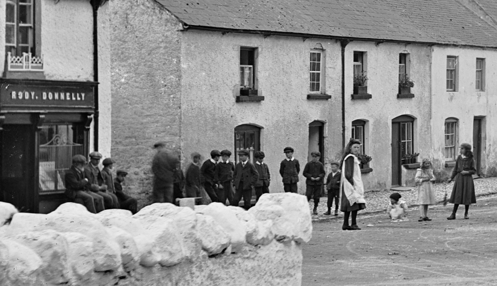 Kinnitty village about 1900 with the Corrigan store to the right. In 1901 Kinnitty village had a population of 271 and 54 houses. By 1926 it was reduced to 140, or almost half – probably due to the departure of the Biddulphs, the Bernard successors, and other Protestant families. Back in the 1830s Lewis states the village had 455 inhabitants and 83 houses. By 1841 it had a population of 621 living in 96 houses.