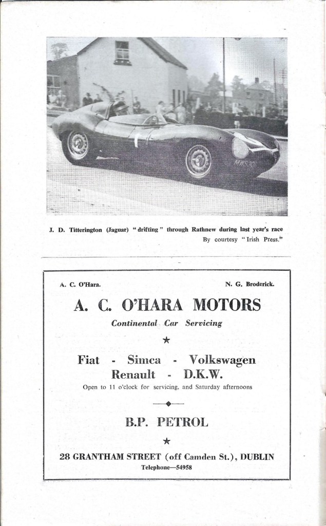 Brendan researched and confirmed the car was bought new by Civil Construction company Gratton’s of Dublin who sold it to Larry Egan in 1953. So, the registration book is a replacement, but contains all the original details including the date of first registration. In speaking to his friend Don Roe Kissane, he reckons that a bloke he knew, Charlie O’Hara, raced the Jaguar while the Egan’s owned it.
