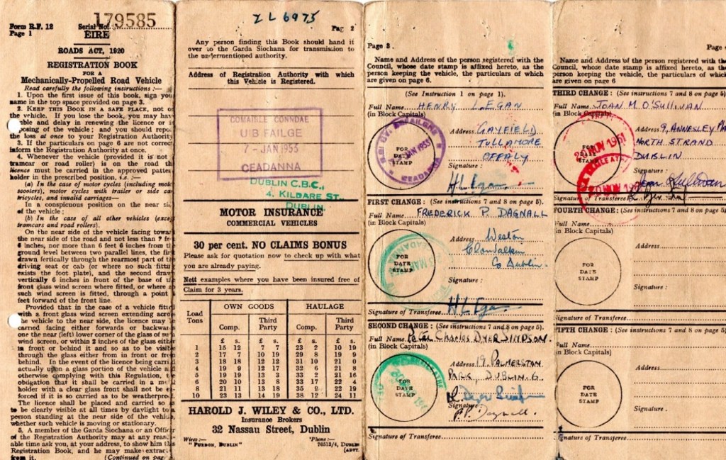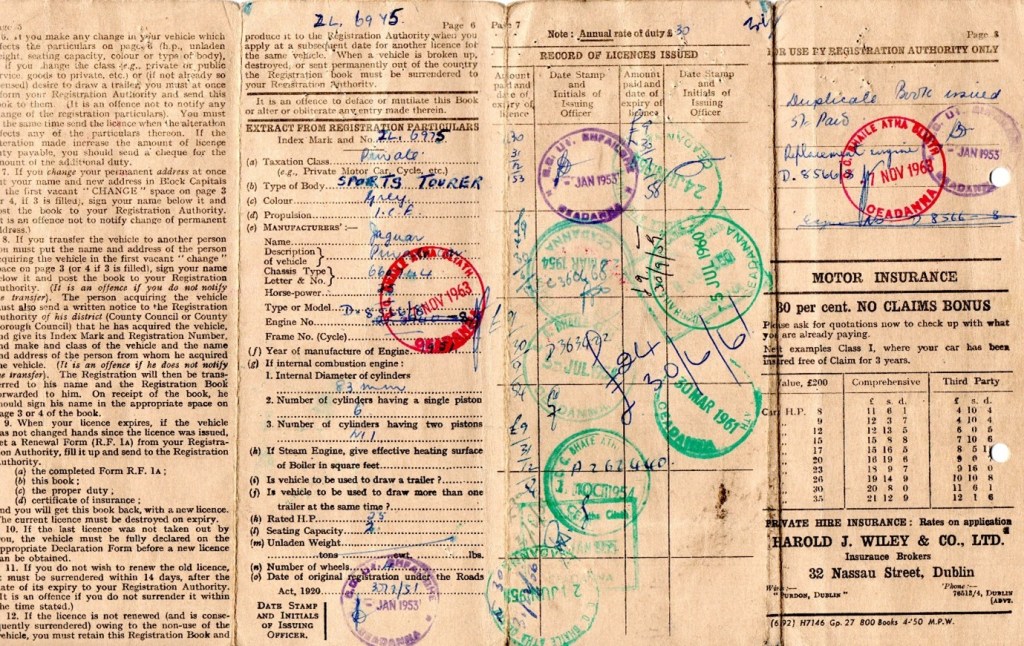 Fig 5. The original license book, courtesy of Brendan McCoy and the Irish Jaguar and Daimler Club.