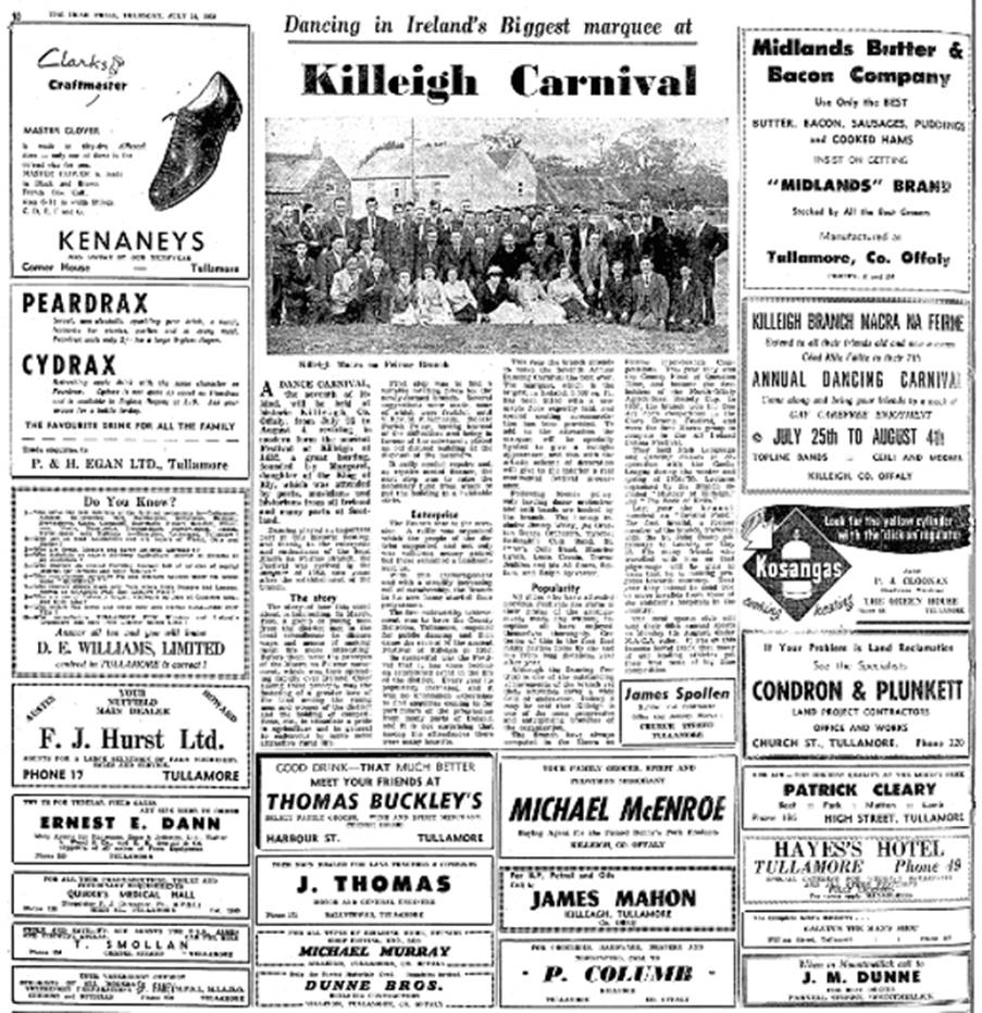 The first noteworthy achievement was to have the County Ballroom, Tullamore, reopened for public dancing and then came the revival of the ancient Festival of Killeigh in 1952. So successful was the Festival that it has since become an established event in the life of the district. Every year its popularity increased, and it was no uncommon experience to find enquires coming in for particulars of the programme from many parts of Ireland and it is not surprising that among the attendances there were many tourists.