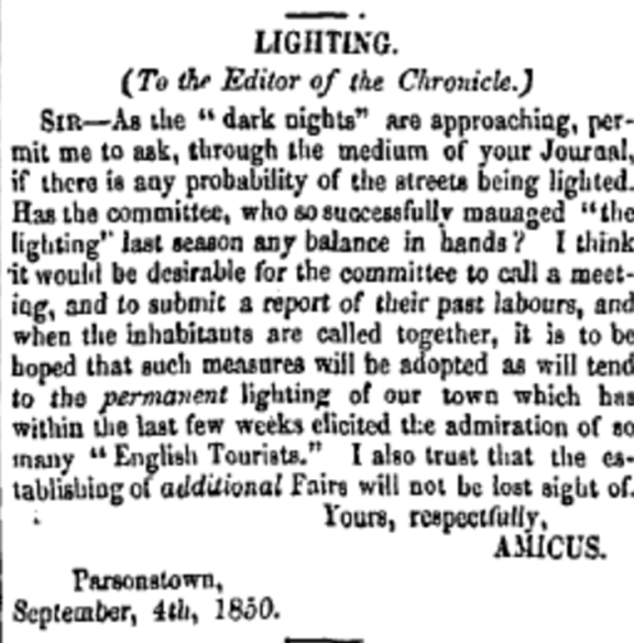 [5] ‘Lighting the Streets’, King’s County Chronicle, Jan 30 1850.