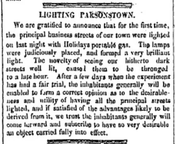 The first indication that Birr/ Parsonstown (as often called in the 19th cent.) had used gas to illuminate the town during the dark winter months was an editorial comment that appeared in the King’s County Chronicle of January 9 1850[1] that extolled how the use of portable gas had made the town safer to move around at night.