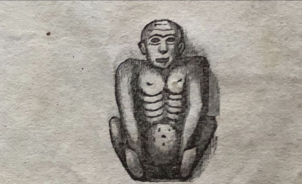 The Roman Catholic chapel in this parish is a tolerable edifice, and the present parish church is not only a plain, but damp and uncomfortable old building. The only thing remarkable about it is its having, projecting from western gable end, an ancient freestone bust of St. Kyran, which probably, ornamented the more ancient fabric. The eastern gable is ornamented with an old freestone window-frame, at some distance from which there also projects from the wall a grotesque figure, in figure, to a small porcelain Greek idol, in possession of the writer of this account. The above engraving is a representation of it