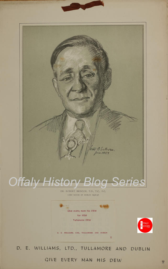 By the 1950s the push was on to sell more whiskey and Irish Mist liqueur. For the US market the emphasis was on quality. Even simple things like the Williams annual calendar did not escape his attention. Soon they too were collectors’ items. Here it was his use of Sean O’Sullivan, Christopher Cambell, Raymond Piper. to depict well known characters in Irish society, especially those associated with the turf, the great hotels and the racecourse. Politicians did not much grace this annual display, but he made an exception for Ben Briscoe, T.D. the Jewish lord mayor of Dublin, who helped Williams promote Tullamore Dew and Irish Mist in the United States in 1957.[1]