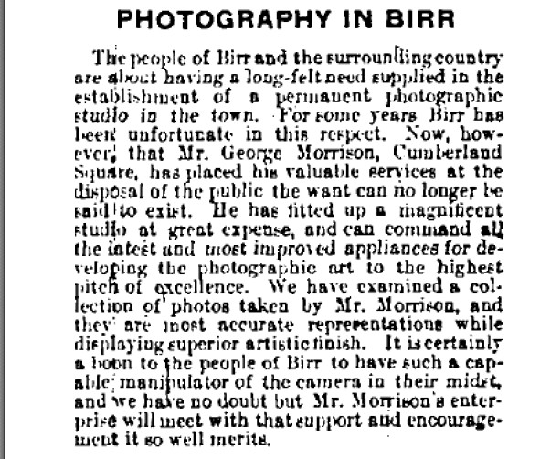 One of Offaly’s pioneering photographers living in Birr in the late nineteenth century was George Morrison, son of Edward, both were jewellers in the town in Duke now Emmet Square. George Morrison was a trained photographer who had opened a studio in his Birr jewellery shop in 1894. He was grandfather to the now acclaimed documentary artist George Morrison of Mise Éire (1959) fame who has just died at the age of 102. It can be said that George Morrison inherited a tradition commenced in the family by his grandfather, but following in the footsteps of many others including Mary, third countess of Rosse.