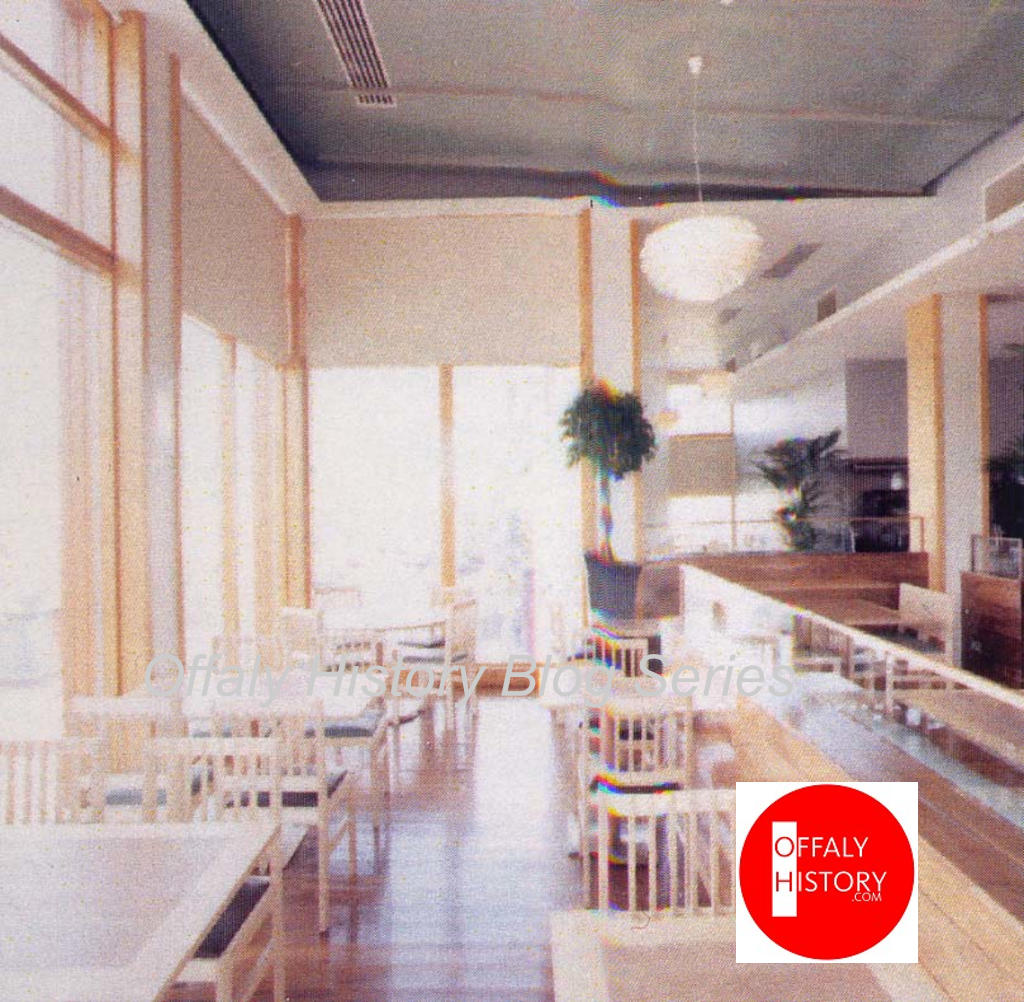 The new building, consisting of a bar, restaurant and nightclub, was designed by Tullamore-based Denis Duggan, architect, in the modern style. The restaurant upstairs had a great view of Patrick Street and Columcille Street while the bar and nightclub were very trendy. It was closed in 2007 and re-ordered as a retail shop for Menary’s in November 2008. The year 2008 was the first time in over 200 years that the part of the site fronting Bridge Street was used as a retail store. It was strange that from the early 1960s when Egan’s modernised the old hotel and despite a succession of owners and considerable expenditure the place never seemed to thrive. Nonetheless it was a major focus in the history of Tullamore and no doubt those who remember the hotel in the 1940s and 1950s would have many stories to tell. If one could go back to when it was first completed in 1785 possibly all of the history of Tullamore could be told from its prime vantage point. One remembers the ‘corner boys’ who spent all day at ‘Hayes’ Cross’ surveying the scene until the practice died out in the 1960s. The old guests’ registers if they survived would tell a lot. So too could the Ridleys and owner James Hayes over thirty years from the mid-1870s. Later the Egan family were the owners with Hayes’s, Colton’s in High Street and Dooly’s in Birr (recently sold to the County Arms, Birr).