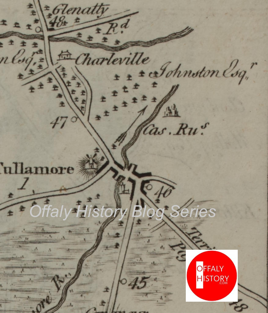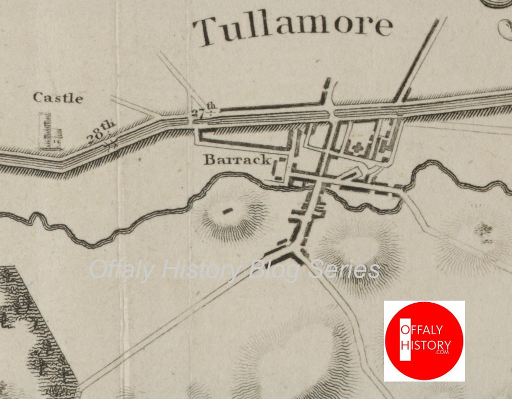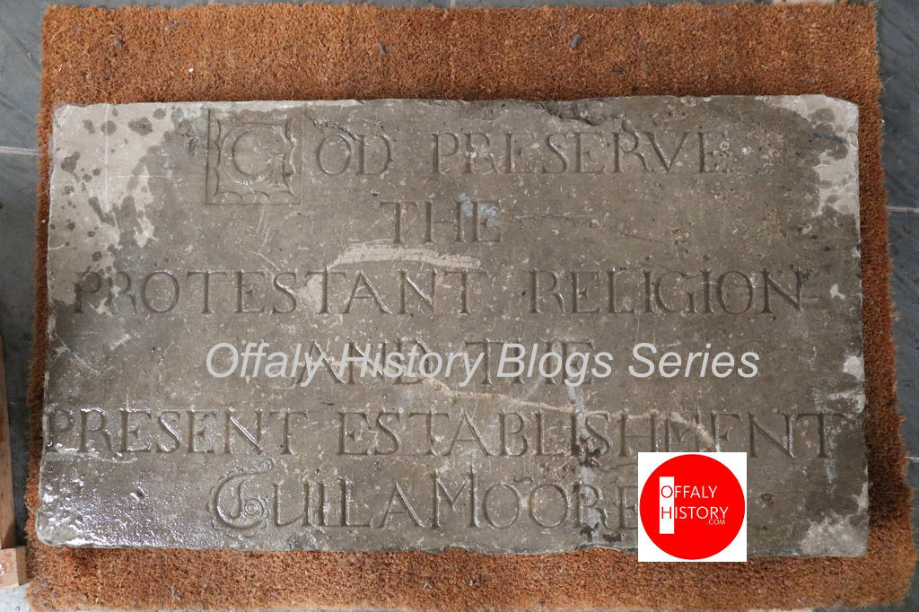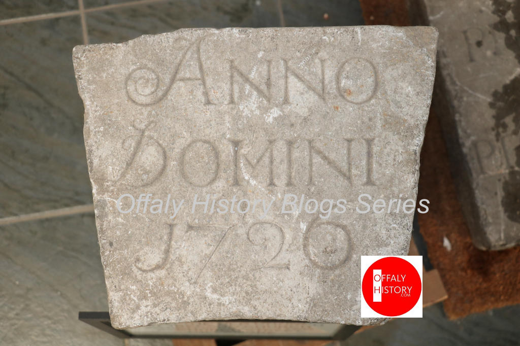 The old church in what was then Church Lane remained in use until the opening of St Catherine’s church in 1815. The new church can be seen at the foot of Church Street. Beside the old church was said to be a cemetery and it was presumably here that some early members of the Moore family were buried, including the first Lord Tullamore (if not at ancestral Croghan). William Lumley in a speech at the opening of the new Methodist church in 1889 (also in Church Street and blog article to follow) recalled being told that the former Episcopalian church was on the other side of Church Street where the Shambles was subsequently placed after 1820. Also that the graveyard was exactly opposite the Methodist church and that his old informant could recall seeing the clay and even the bones of the dead carted away and spread on the fields for top-dressing and that close by was an oak tree plantation. It is said that some tombstones were found in Market Square in the nineteenth century. In 1940 a portion of a tombstone was recovered in repair work and some members of the council referred to the local belief that part of the Market Square had once been used as s cemetery.[2]