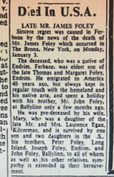 James was living on Milton Street in the Greenpoint district of Brooklyn when he applied for US citizenship in 1933. After his marriage to Mary Egan, the daughter of Mr & Mrs Lawerence Egan from Kilcormac, the couple lived at Inwood on Manhathan and later in the Bronx.