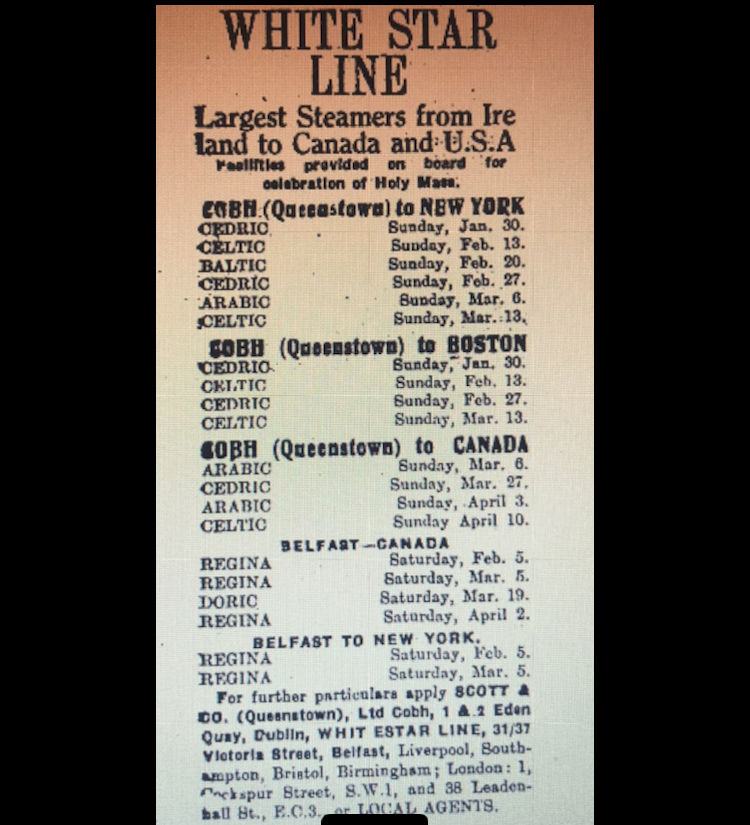 The 1920’s saw high levels emigration to the United States from Ireland. Among those crossing the Atlantic Ocean was James Foley from Endrim near Ferbane. James was 21 when he boarded the RMS Cedric at Cobh enroute to New York in March 1927.