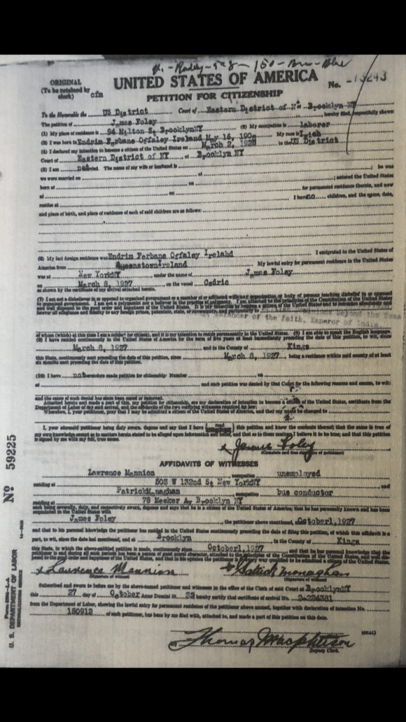 United States of America Petition for Citizenship. James Foley 1933.