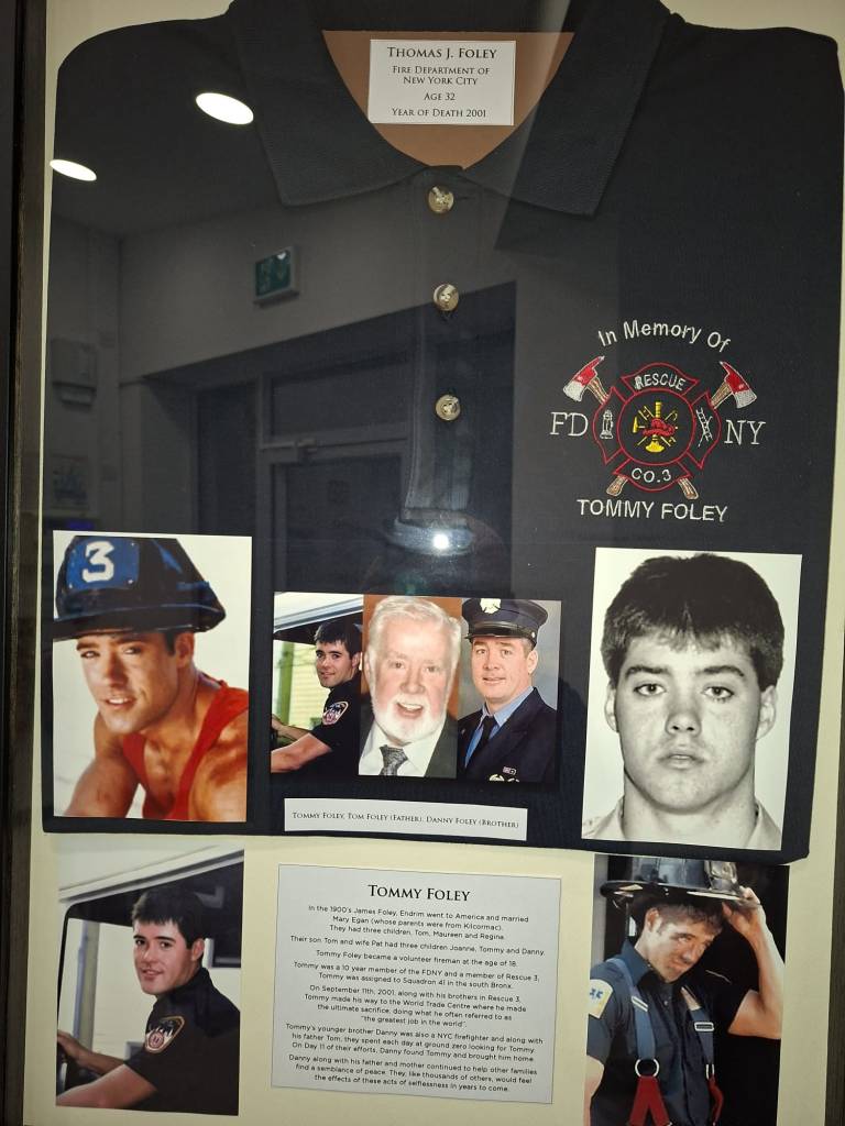 In September 2023, life-size statues of Tommy and Danny Foley were unveiled at the West Nyack Hamlet Green and Firefighter Memorial Park in Clarkstown, Rockland County. In April 2025, members of the Foley family from New York visited Ferbane Fire Station to meet members of the local Fire Brigade and view the Memorial situated there which is dedicated to Tommy, Danny and their father Tom. Apart from the obvious linkages, the positioning of the monument has other subtle but important connections to the Foleys. Another member of the clan, Peter Foley emigrated to New York in the 1950’s, following his return to live on Ballycumber Road, along with his wife Kathleen he ran a successful petrol station and was heavily associated with the local GAA club, but he also a long serving member of the Ferbane Fire Brigade. The modern state of the art Fire Station was officially opened in 2018. It is situated at the rear of the old council office, a building which for almost 80 years housed Ferbane Railway Station, from where James Foley probably set out on his journey to New York in the Spring of 1927.