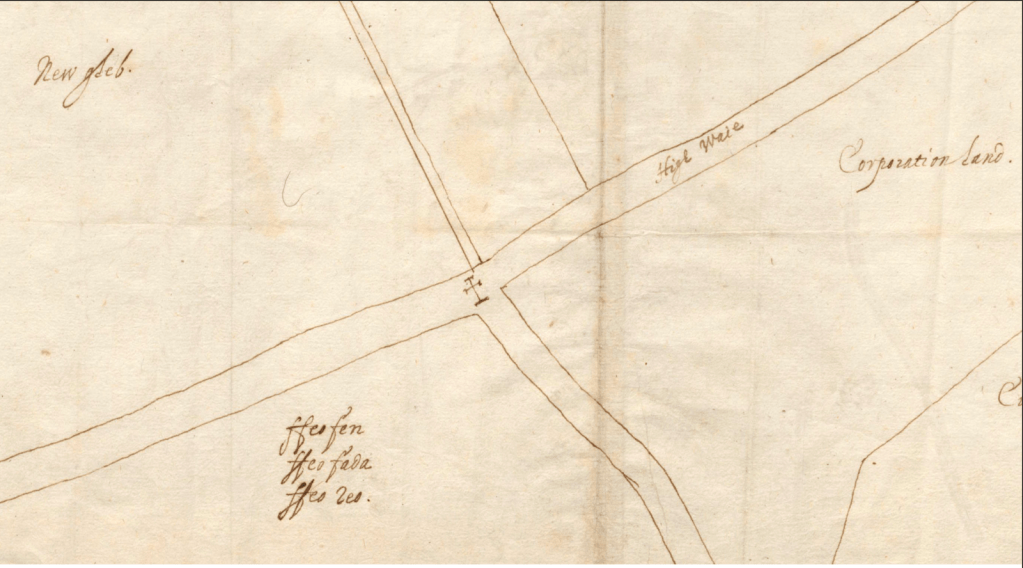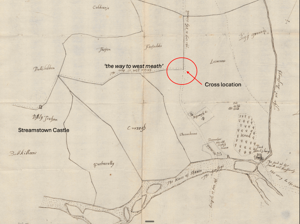 We are extraordinarily fortunate that the Banagher Cross appears on four of the De Renzy’s maps drawn almost exactly four hundred years ago. Without them, its original location would be lost to us. The fact that the surveyors marked the cross at the junction leading into the town is telling. It shows that in the 1620s the cross was still a recognised landmark, important enough to be fixed in the cartographic record alongside streets and burgess plots.