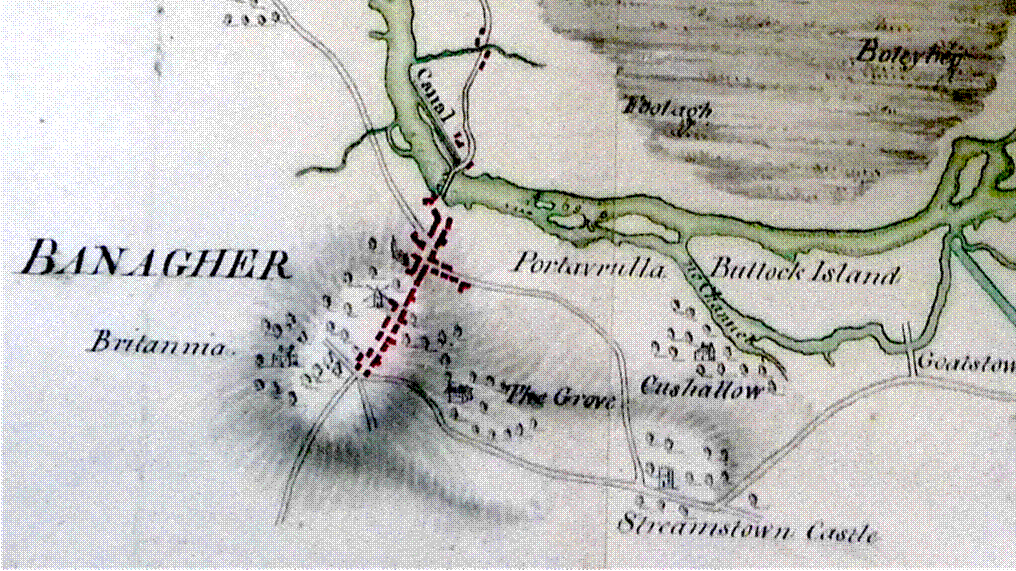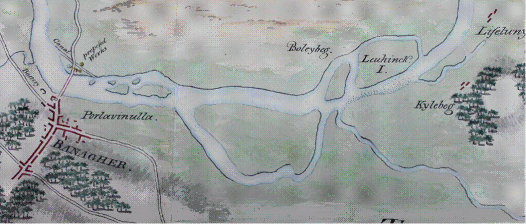 The place name ‘Portavrolla’ in Banagher can be traced back at least 450 years. Just very recently one ‘r’ was dropped so we now have Portavolla. ‘Port an bhrollaigh’ means ‘the port or harbour at the breast’ (of the hill). Moiler McCoghlan, pardoned by Queen Elizabeth in 1571 was of Porteabroghla and Portwroly appears on a 400 year old map.