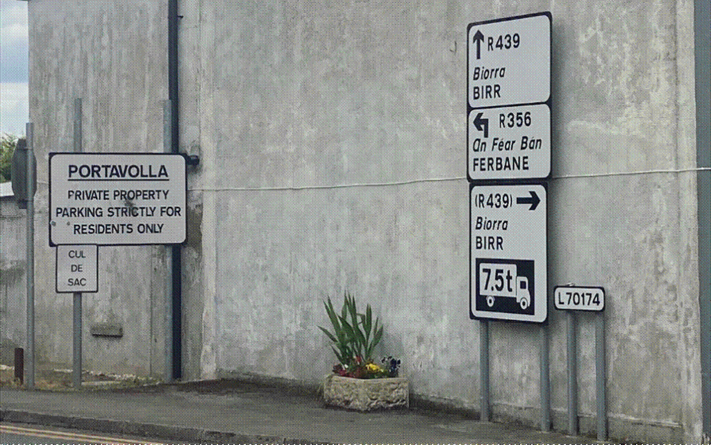 The signage at the entrance to Portavo(r)lla Housing estate is unlikely to win an award for creative presentation. PORTAVOLLA PRIVATE PROPERTY PARKING’ probably could be removed without being missed. Signs for Ferbane and Birr could be in a better location.This wall would be ideal for a mural.
