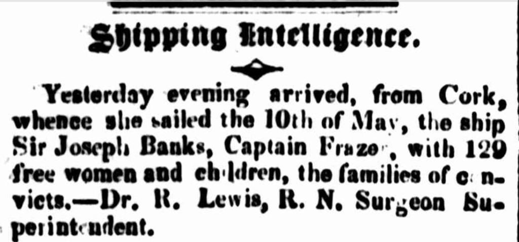 Eleanor and her daughter were given permission to emigrate to Australia. They arrived as settlers in Sydney on the Sir Joseph Banks on 7 Oct 1828. They had set sail from Cork and appear on the ship’s passenger list as “Eleanor Conway & girl under 12”. The ship carried many families of transported convicts.