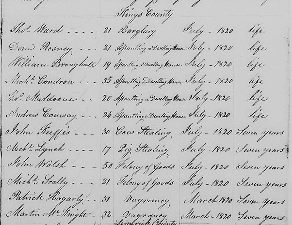 | Michl Lynch | 17 | Pig Stealing | July 1820 | Seven years |