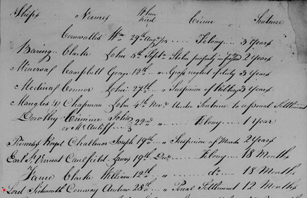 | 2173 | Conway, Andrew | 31 | G.S. | Lord Sidmouth | 1821 | Life | Cat | Labourer John Kair | Market Street Sydney |