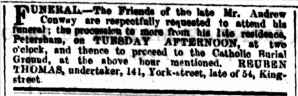Funeral notice of Andrew Conway, Sydney Morning Herald, 26 Mar 1860, image online at https://trove.nla.gov.au/newspaper/article/13038327.