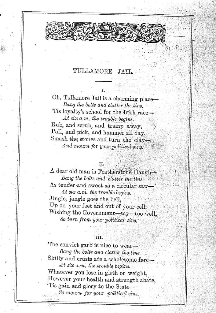Among those arrested and imprisoned was Timothy Daniel Sullivan, MP and Lord Mayor of Dublin, and author of the poems contained in Prison Poems; or Lays of Tullamore. During his life he wrote a considerable body of poems and songs, two of which are particularly well known: `Ireland, Boys, Hurrah’, which, oddly, was sung by both sides at the Battle of Fredericksburg in the American Civil War, and `God Save Ireland’, written a few days after the execution of the Manchester Martyrs, which would become an unofficial anthem of Irish nationalism.