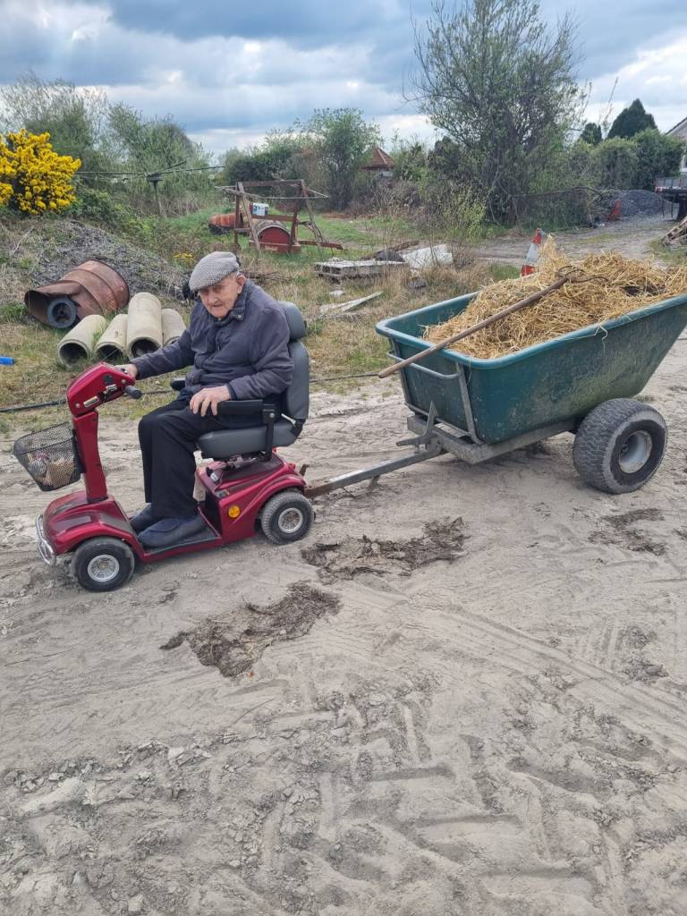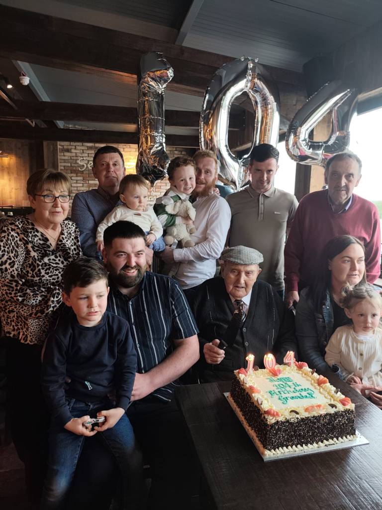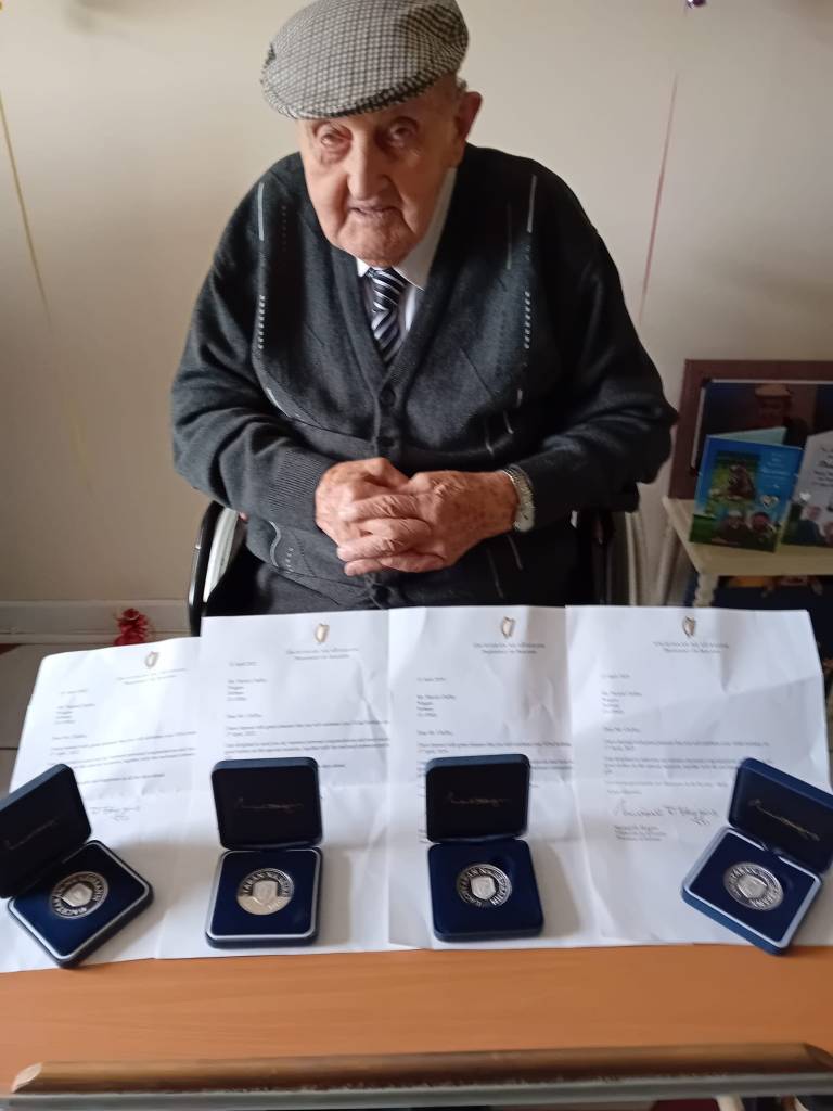 Paddy worked on the farm and on the bog until well into his nineties. Because of lockdown, his 100th birthday was celebrated outside his house in Noggus, where well-wishers were invited to drive by and beep. Paddy was in his element, waving at the queue of cars. Better than any party, he said. He received a cheque and a congratulatory letter from President Michael D. Higgins. On his 101st and every subsequent birthday since, he has received a specially designed commemorative coin and a Presidential letter.